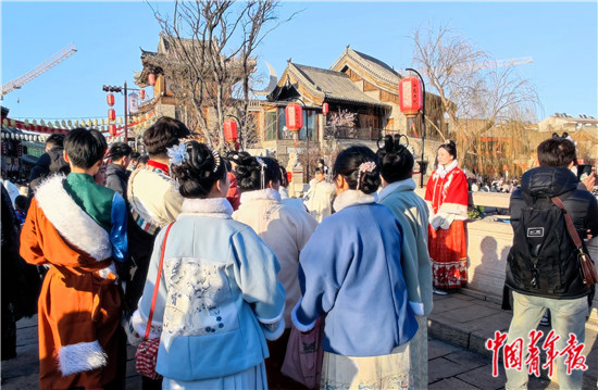1月27日,洛阳洛邑古城景区内,身穿汉服排队等待拍照的年轻人。