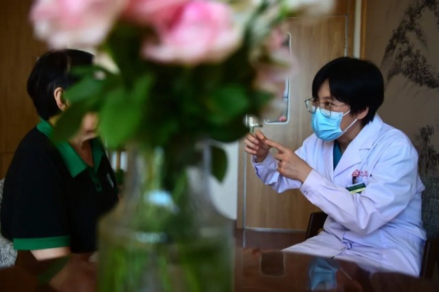 2022年9月2日,河北沧州市人民医院安宁疗护科主任郭艳汝为新来的一位患者进行心理疏导。王民 摄