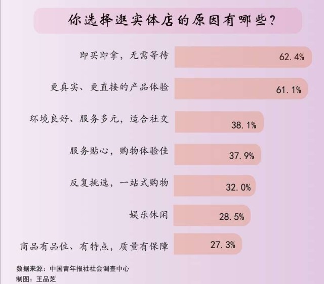 调查中,大家选择逛实体店的原因主要有即买即拿,无需等待(62.4%)和更真实、更直接的产品体验(61.1%)。