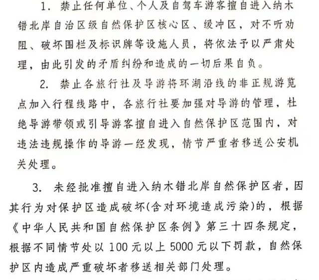 据悉,西藏班戈县文旅局曾在2022年3月31日发布《关于禁止在纳木错北岸自然保护区内开展旅游活动的公告》,禁止任何单位、个人及自驾车游客擅自进入纳木错北岸自治区级自然保护区核心区、缓冲区。并杜绝导游带领或引导游客擅自进入自然保护区范围内,对违法违规操作的导游一经发现,情节严重者移送公安机关处理。