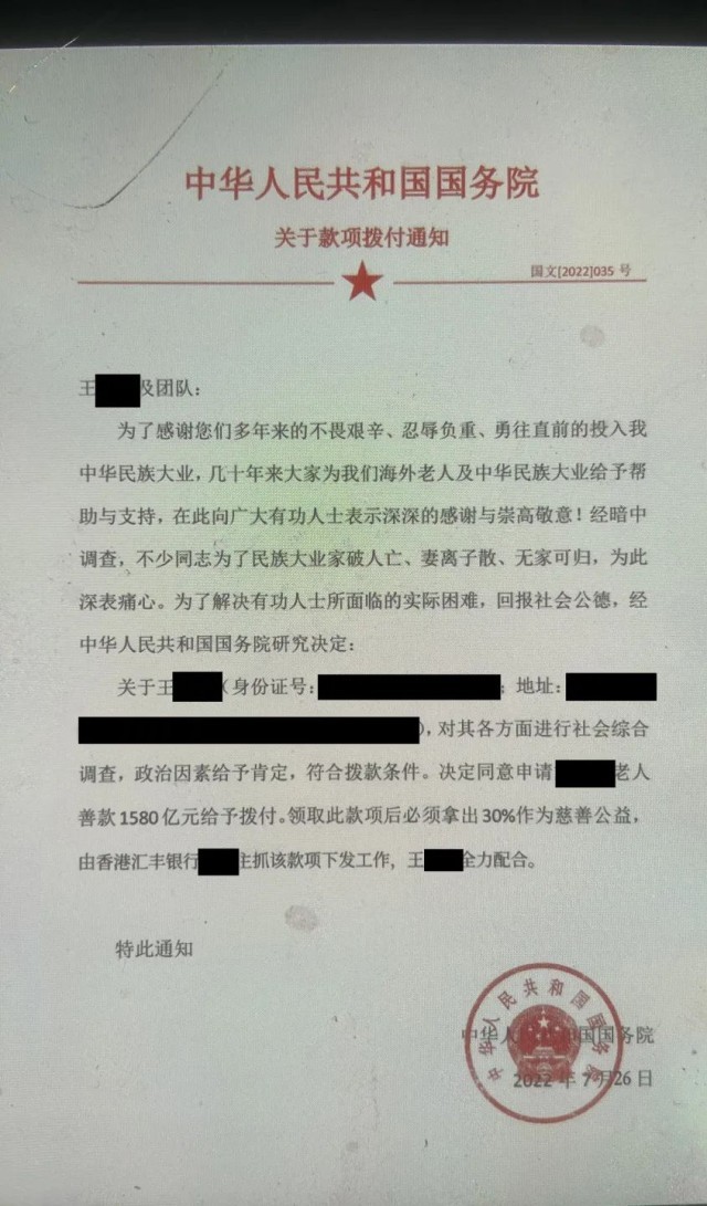 经审讯,该“民族资产解冻”类诈骗团伙冒充国家工作人员,虚构一个所谓的“扶贫基金会”,通过P图手段制作虚假的国务院工作证和民族资产解冻委员会红头文件等虚假资料,在各种微信群中宣传。