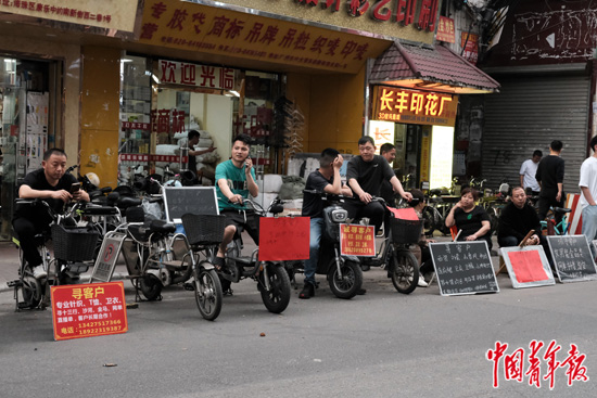每年年初开工都会出现“招工热”,康乐村的招工街人头攒动,老板们举着纸板,写着“服装种类+工种+人数”,再加上加粗的“简单”“高价”等字眼吸引工人。大部分老板沉默着,举着牌子玩手机。也有着急的,大喊着“看一下!看一下!”