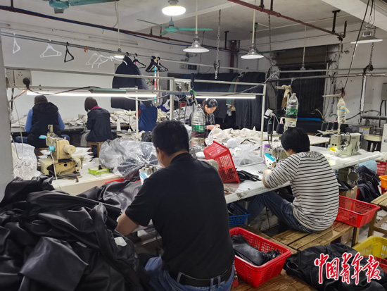 他的工厂“窝”在广州市白云区棠涌村的一幢厂房的3层,厂房一共6层,每层都是独立的小工厂。楼里电梯已经废弃,墙壁除了霉斑遍布,还贴着“低价通厕”“搬厂转仓”“高价回收库存衣服”的小广告。晚上9点,他厂里的40多台缝纫机仍未停歇。机器旁挂着矿泉水瓶,为了给丝线降温。丝线飞速运转,可能会烧坏正在加工的人造皮革。
