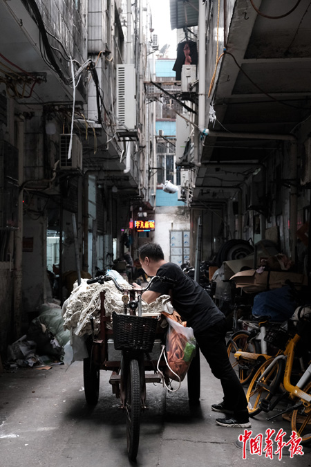 他住在一栋“握手楼”的4层,一个月房租400元,白天能勉强靠自然光看清楼梯。门窄得只容一人通过,4平方米左右的房间里只摆着一张高低床。
