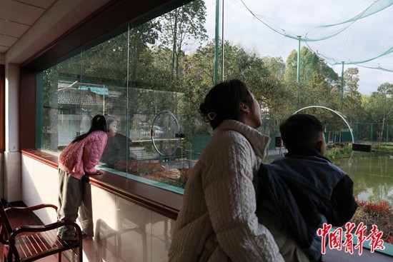 3月18日,陕西汉中洋县朱鹮生态园,一名洋县本地的游客利用周末时间带着孩子看朱鹮。透过观鸟台的玻璃窗,游客可以近距离观赏朱鹮野化放飞训练大网里人工繁育的朱鹮。