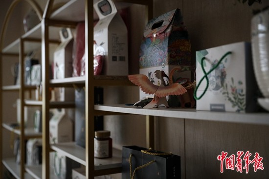 3月19日,陕西汉中洋县草坝村,村民华英家民宿一楼的展示柜上,摆放着朱鹮形象的工艺品和有机黑稻、土蜂蜜等洋县特色农产品。