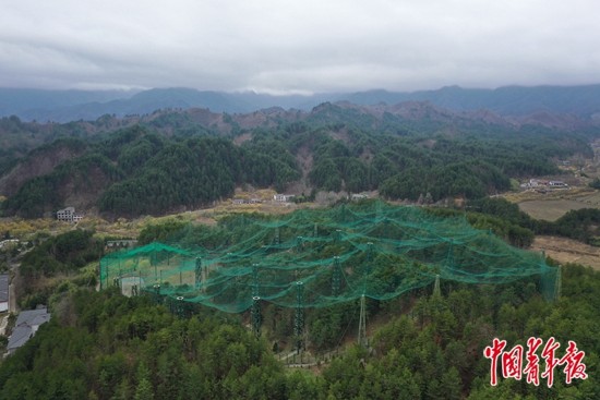 3月18日,陕西汉中朱鹮国家级自然保护区华阳朱鹮繁育野化种源基地。这个位于秦岭南麓、占地3.4万平方米的朱鹮野化放飞训练大网为70多只人工繁育的朱鹮提供了最接近野外的生存环境。(无人机图片)