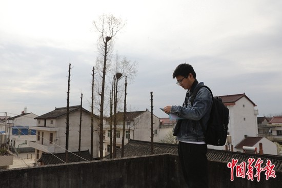 3月19日,陕西汉中洋县白鹤村,95后野外巡护员韩宗良在一处民居天台上记录朱鹮筑巢的情况。在洋县,目前记录在案的野外朱鹮巢址有二三百个,超过一半在村民生活区附近。朱鹮的繁殖地和野外病伤亡信息大多数依靠当地居民提供。每年3月-7月是朱鹮的繁育期,韩宗良需要在巢址点位反复巡逻,确认朱鹮安全的同时,也记录它们的行为习惯。