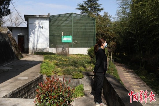 3月18日,陕西汉中洋县,陕西朱鹮救护饲养中心,饲养员张芬在朱鹮笼舍外休息。她从2020年开始负责这一区域7个笼舍朱鹮的“日常起居”。其中既有人工饲养的,也有在野外受伤被送到这里医治的朱鹮。