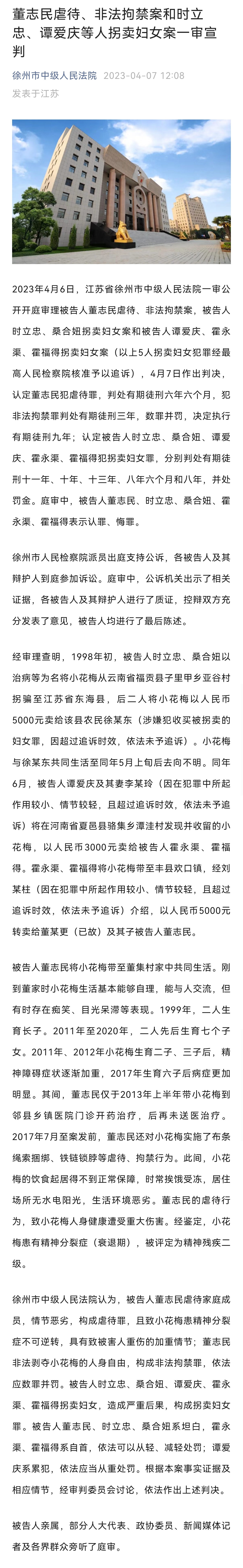 今天,江苏省徐州市中级人民法院一审公开宣判被告人董志民虐待、非法拘禁案,被告人时立忠、桑合妞拐卖妇女案和被告人谭爱庆、霍永渠、霍福得拐卖妇女案。