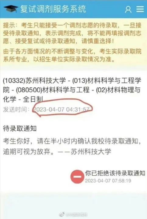 一张截图显示,苏州科技大学材料科学与工程学院在4月7日凌晨4点31分发布了待录取通知,要求考生“在半个小时内确认我校待录取通知,逾期可视为放弃”。