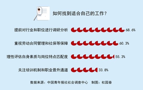 如何找到适合自己的工作?68.6%的受访青年建议提前对行业和职位进行调研分析,60.3%的受访青年提醒在求职中重视劳动合同管理和社保等保障,55.3%的受访青年认为要理性评估自身素质与岗位特点的匹配度,33.8%的受访青年提醒关注培训机制和职业晋升通道。