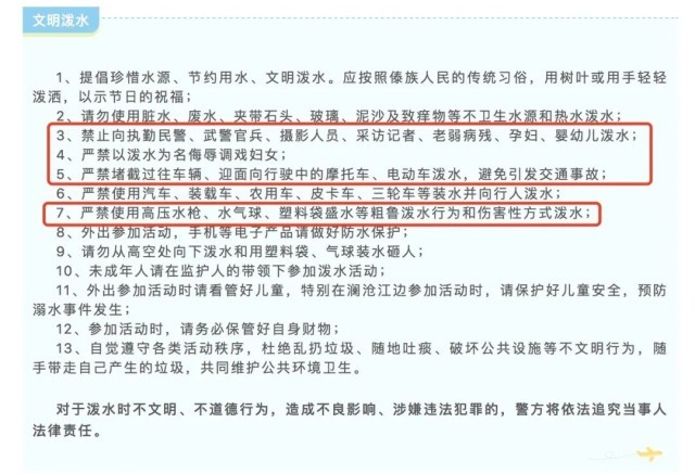 其中提到,严禁以泼水为名侮辱调戏妇女;严禁堵截过往车辆、迎面向行驶中的摩托车、电动车泼水,避免引发交通事故。