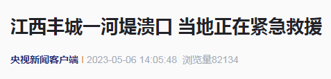 据央视新闻客户端消息,记者今天(5月6日)获悉,受强降雨影响,江西宜春丰城市丽村镇清丰河堤下江段河堤溃口30余米,下游4个村庄被淹,200余人受灾,当地各部门正在紧急救援,封堵溃口。