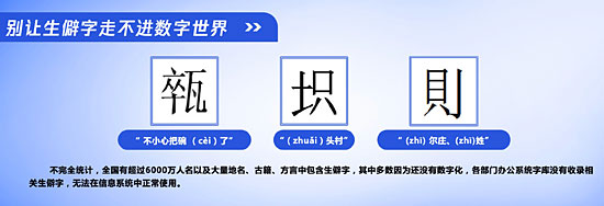 据统计,全国有6000万人名及大量地名、古籍、方言中包含生僻字,其中多数尚未实现数字化。很多人名、地名中的生僻字还无法在信息化系统中正常使用。