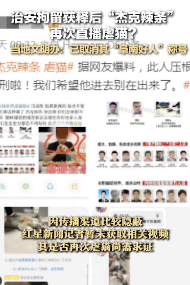 今年4月底,美食博主徐某辉(网名@杰克辣条)因虐猫事件引发关注。