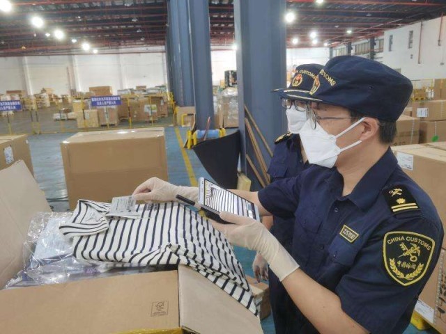 图为海关关员对相关产品进行抽检。上海海关供图。