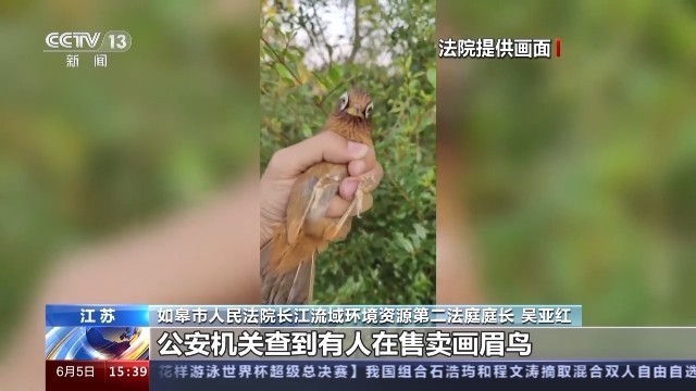江苏省如皋市人民法院长江流域环境资源第二法庭庭长 吴亚红:在我们南通地区,公安机关查到有人在售卖画眉鸟,然后调查后就找到了贾圣培。经过当地公安机关的协助,抓到了贾圣培。经过进一步核查,查到了贾圣培上游的出售者和贾圣培下游的收购者。