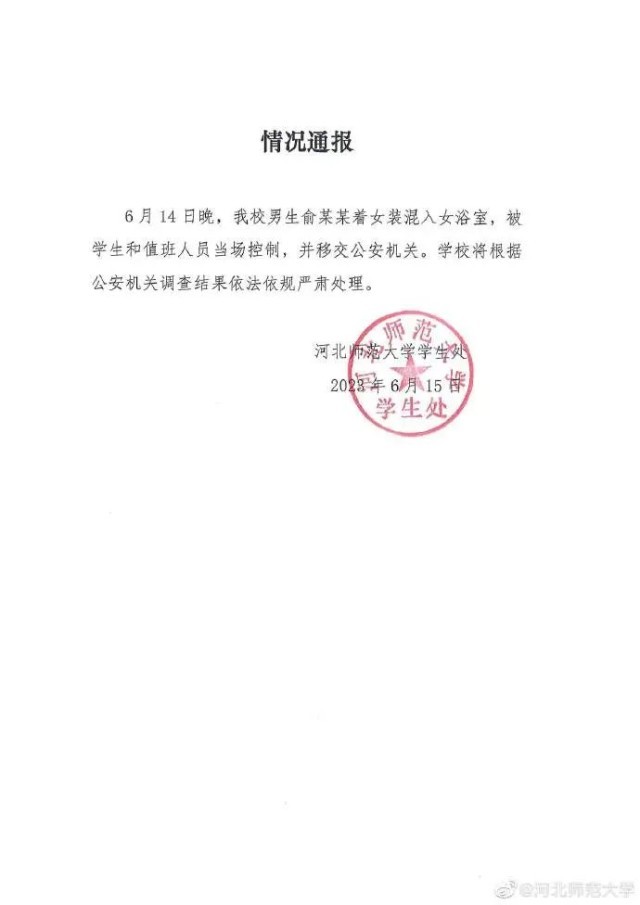 6月15日凌晨,@河北师范大学 官方微博发布情况通报: