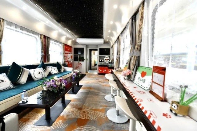 从主题改造到文创陈列,他们在“熊猫专列”多功能车厢内设置了明信片书写区、集戳区、休息区等多个主题区域,展现着文化与旅行的趣味碰撞。