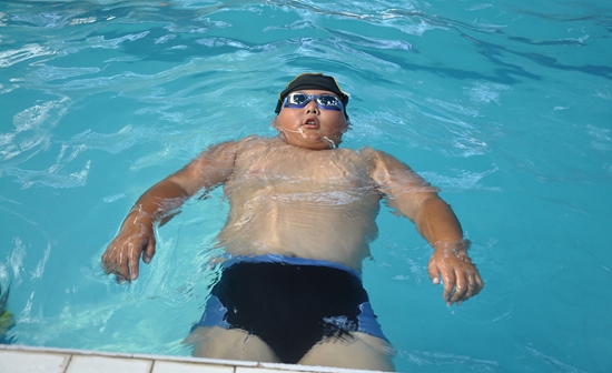 郑州市某“小胖墩减肥夏令营”里,一个“小胖墩”正在游泳。视觉中国供图