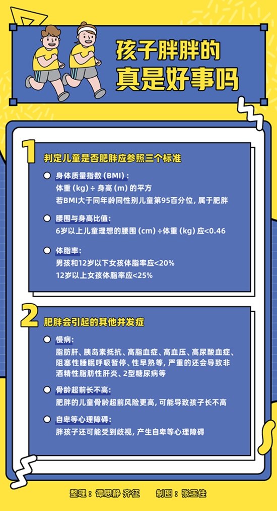 儿童肥胖比“中年发福”危害更大。儿童期肥胖是引起成人肥胖及各种并发症的危险因素之一,并且孩子成年后患慢性疾病的风险概率增加,特别是心血管疾病和代谢性疾病。