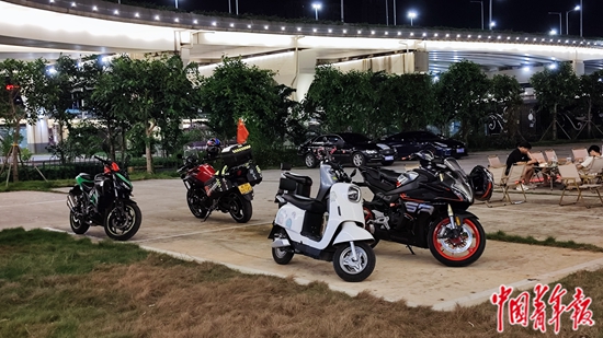 6月底,在广西南宁清川大桥附近,不少摩托车爱好者在此聚集交流。王军利/摄