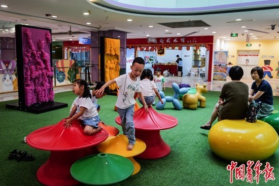 7月12日中午,北京崇文门商圈一家商场内,几名小朋友在玩耍,一旁的家长一边照看孩子,一边聊天。商场内设置的公共设施,也为孩子和家长提供了社交场所。