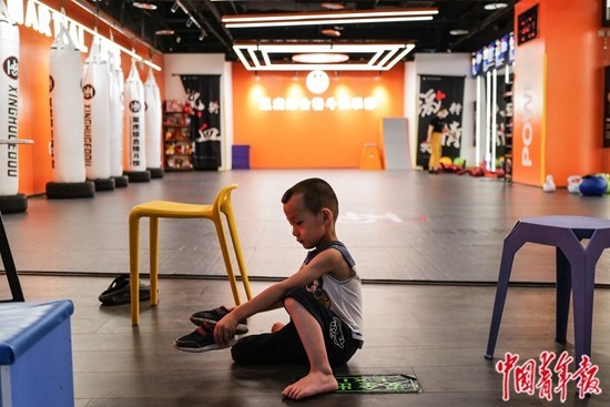 7月10日晚上,北京亚运村商圈一家商场内,5岁的李仁禹上完搏击课后准备穿鞋和母亲回家。