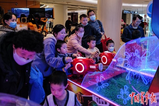 2月18日,北京奥体商圈一家商场内,家长带着孩子在玩水枪游戏机。