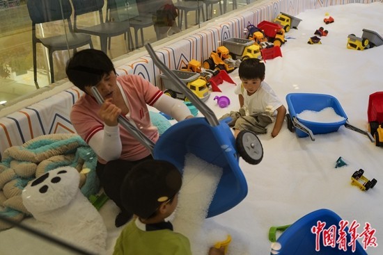 7月10日,北京朝阳公园附近一家商场内,一位老人在陪孩子玩沙子。近年来,这类亲子互动的项目越来越受到大众的欢迎。