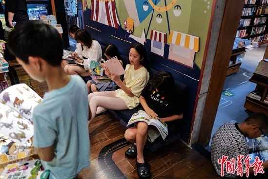 7月10日,北京朝阳公园附近一家商场的书店内,11岁的张芷维(中)在看书。她刚刚随家人从新西兰回国探亲。