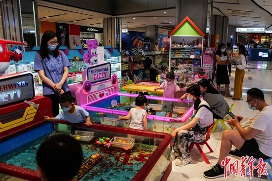 2022年6月26日,北京北四环一家商场内,家长带着孩子在钓鱼。