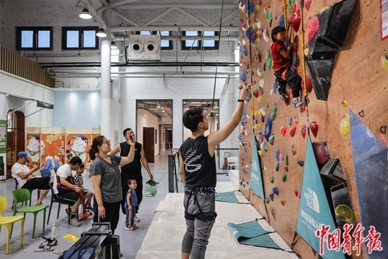 7月9日,北京冬奥村一家商业综合体内,7岁的贾斯伯(右一)在教练的引导下第一次尝试练习攀岩。除了攀岩,他还参加了绘画、街舞、架子鼓、编程等课程。