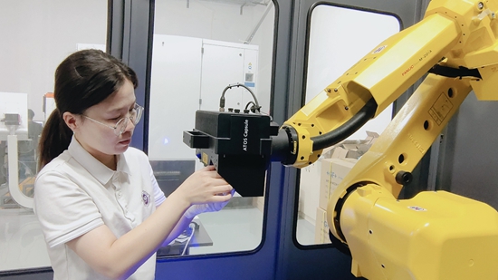 90后青年技工陈贵玲在实验室用3D扫描仪检测工件。
