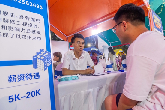 7月28日,河南郑州,“招聘夜市”中原区万达专场举办,50家用人单位在招聘会场接受求职者咨询,共提供招聘岗位1万余个。视觉中国供图
