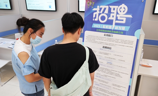 7月22日,江苏省连云港市人力资源市场,求职者在查看和了解岗位招聘情况。视觉中国供图