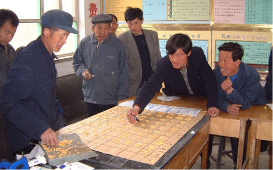 1999年,叶敬忠倡导桑岗村村民讨论乡村发展,村民用玉米粒为议题重要性排序,右二为赵文录。