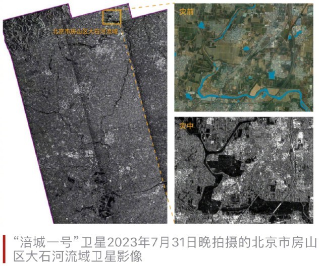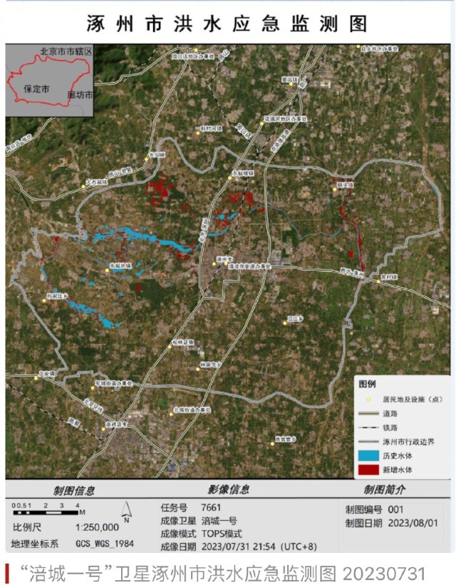 7月29日以来,受台风“杜苏芮”影响,京津冀地区持续强降雨。由于极端强降雨天气和上游河道行洪等因素,河北省涿州市内涝风险加剧,防汛形势十分严峻。部分区域最大累计降雨量接近1000毫米,最大小时降雨量超100毫米。由“涪城一号”卫星7月31日21时54分成像的卫星影像结合灾前卫星影像显示,涿州市的历史水体面积约为15平方公里,截至7月31日晚,该地区灾中新增水体面积约21.55平方公里,受灾耕地面积约为8.45平方公里。