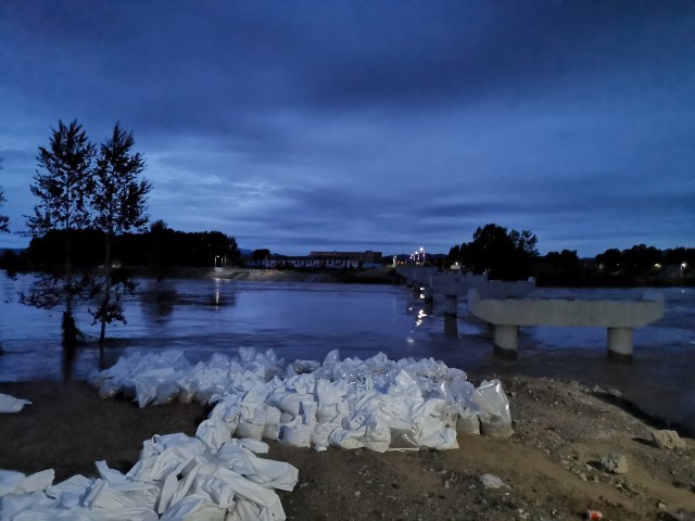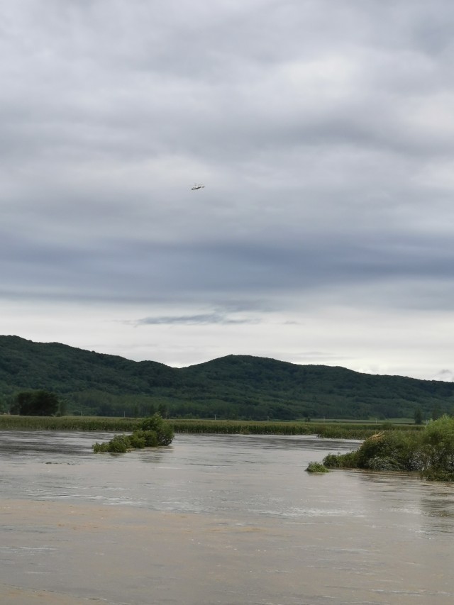 黑龙江五常市向阳镇与吉林省舒兰市金马镇(图中对岸)隔河相邻,正在修建的大桥左侧原本有座便桥,现已被洪水淹没,状况不明。