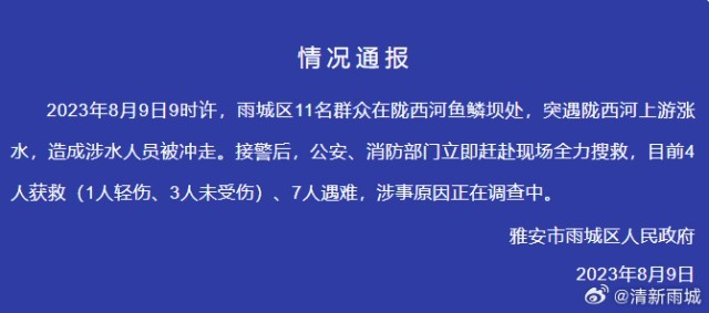 2023年8月9日9时许,雨城区11名群众在陇西河鱼鳞坝处,突遇陇西河上游涨水,造成涉水人员被冲走。接警后,公安、消防部门立即赶赴现场全力搜救,目前4人获救 (1人轻伤、3人未受伤)、7人遇难,涉事原因正在调查中。