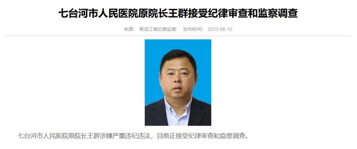 黑龙江省纪委监委网站10日通报:七台河市人民医院原院长王群涉嫌严重违纪违法,目前正接受纪律审查和监察调查。