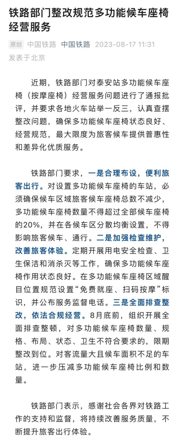 文中指出,近期,铁路部门对泰安站多功能候车座椅(按摩座椅)经营服务问题进行了通报批评,并要求各地火车站举一反三,认真查摆整改问题,确保多功能候车座椅状态良好、经营规范,最大限度为旅客候车提供普惠性和差异化优质服务。