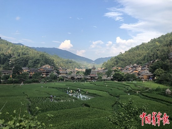 8月18日,孩子们在肇兴侗寨外的水田玩耍。中青报·中青网记者 李雅娟/摄