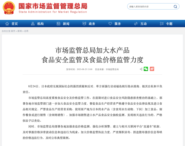 8月24日,日本政府无视国际社会的强烈质疑和反对,强行启动福岛核污染水排海,极其自私自利、极其不负责任。市场监管总局高度重视食品安全及价格监管工作:
