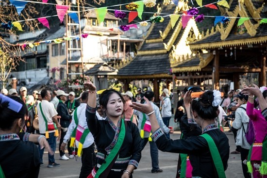 2月5日,云南普洱景迈山景迈大寨内,当地少数民族男女盛装舞蹈庆祝传统节日。视觉中国供图