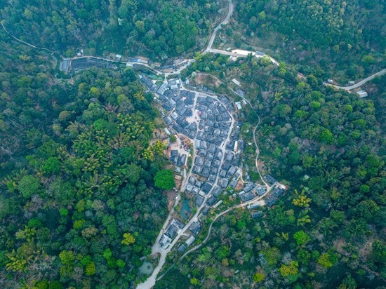 2月25日,鸟瞰云南省普洱市澜沧县惠民镇糯干古寨,整个古寨环绕在景迈山古茶树中。视觉中国供图