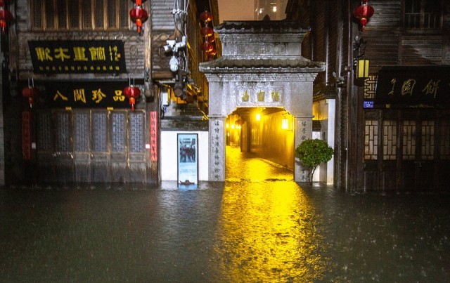 2023年9月6日凌晨,福州,暴雨中的三坊七巷成一片“汪洋”。