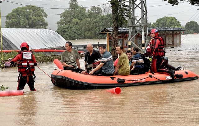 2023年9月5日,受台风“海葵”带来的强降雨影响,福州市闽侯县南通镇多处村庄被淹。福建森林消防救援人员出动橡皮艇转移受困民众。