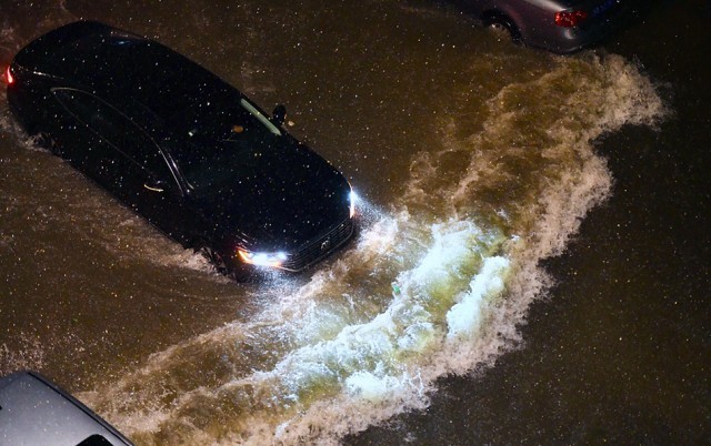 2023年9月5日晚,福州,市民开车经过积水路段。